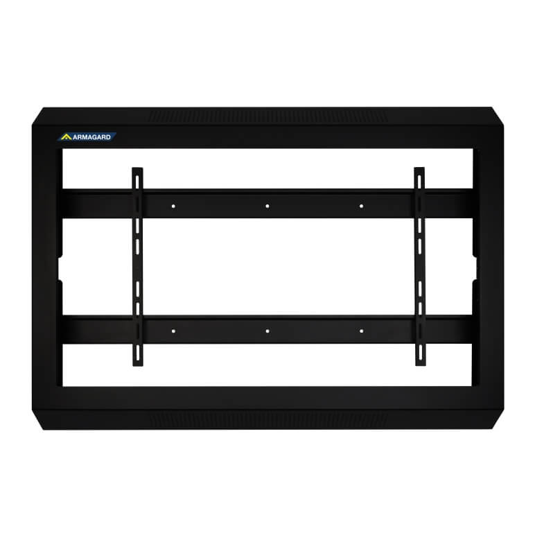 Slagfast inomhus TV-skydd stödjer installation av alla VESA-monterade kommersiella bildskärmar. Systemet består av två huvudkomponenter: bildskärmen fästs först på ett väggmonterat internt fäste, därefter monteras det skyddande TV-skalet över skärmen och låses på plats med försänkta skruvar samt två nyckelmanövrerade lås.