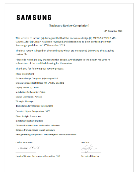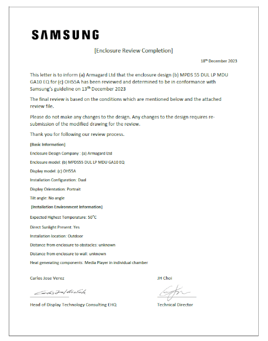 | Avancerat Miljökontroll Kort | Skyddar skärmar och komponenter under alla årstider och alla väder. Styrkortet driver fläktar, värmare och automatisk avstängningsfunktion. Du får sinnesfrid när det gäller livslängden och tillförlitligheten för din investering under alla tider på året. |