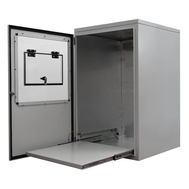 | Mycket Anpassningsbar | Möjligheten att lägga till åtkomstportar, statiska och skjutbara hyllor och främre och bakre dörrar gör detta till ett idealiskt hölje att anpassa till precis hur du vill ha det. Den kan även användas som stativ för Armagard datorskåp. |